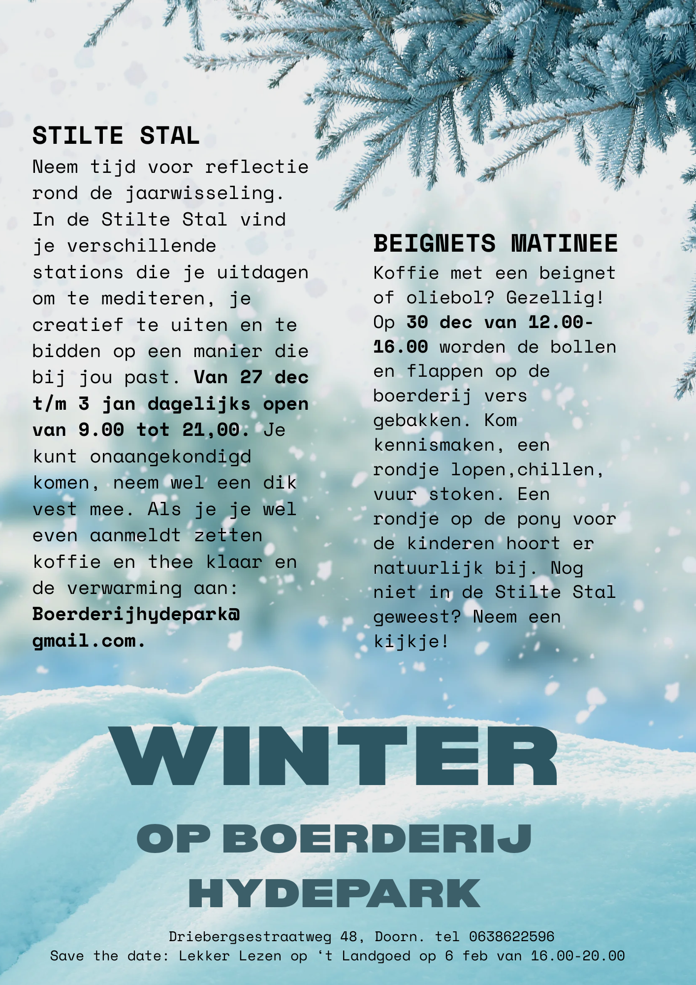 Koffie met een beignet of oliebol? Gezellig! Op 30 dec van 12.00-16.00 worden de bollen en flappen op de boerderij vers gebakken. Kom kennismaken, een rondje lopen, chillen, vuur stoken. Een rondje op de pony voor de kinderen hoort er natuurlijk bij. Nog niet in de Stilte Stal geweest? Neem een kijkje!